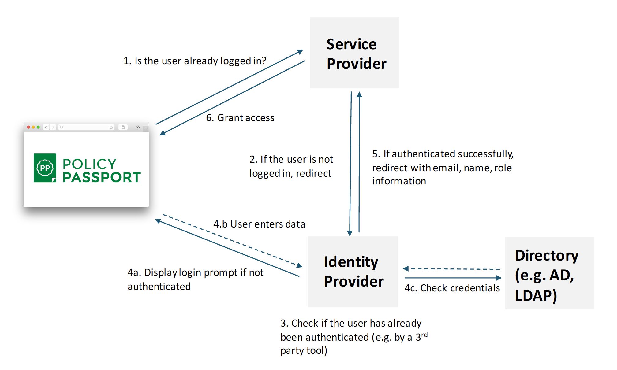 When the user tries to access the ELLOapplication in the browser, the Service Provider (SP) checks if the user is already authenticated. If not, then the user is redirected to the Identify Provider (IDP), which initiates the authentication (e.g. via username and password). After successful authentication, the user is redirected back to the Service Provider which grants access to the ELLO application. The IDP provides attributes, e.g. email address, to the Service Provider (SP) which are used to properly identify the user within ELLO.